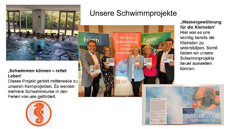 Unser Projekt "Schwimmen können rettet Leben" umfasst derzeit zwei Ferienschwimmkurse pro Jahr und ist bereits eines unserer Kernprojekte geworden, da es seit einigen Jahren sehr gut angenommen wird. Viele Kinder können dank diesem Projekt nun Schwimmen, die meisten haben sogar das Seepferdchen erreicht.